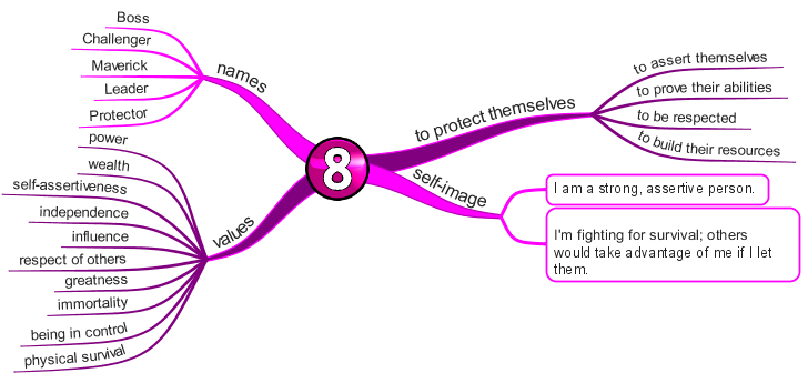 Eights like to see themselves as strong, assertive people who are in control. They don't want others to control them; they want to determine their own course in life. They seek independence from the influence of others, demanding that they get the autonomy they want. They also feel a strong need to protect themselves, others who are close (e.g., family), their achievements, and their legacy.